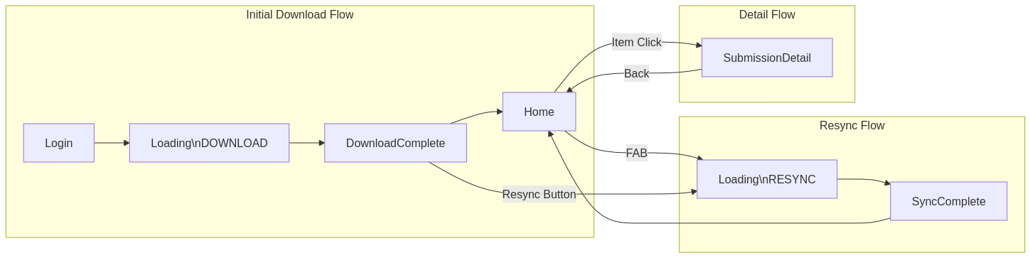 Login- Entry point for logged-out usersLoading(type: LoadingType)- DOWNLOAD or RESYNCDownloadComplete(totalEntries, latestSubmissionDate)Home- Entry point for logged-in usersSubmissionDetail(uuid)SyncComplete(addedRecords, updatedRecords, latestRecordTimestamp)